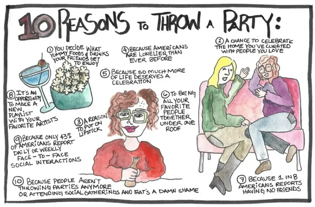 “Everyone wants to attend parties, but no one wants to throw them. We just expect them to appear when we need them, like fire trucks,” said Ellen Cushing in a recent article for The Atlantic.