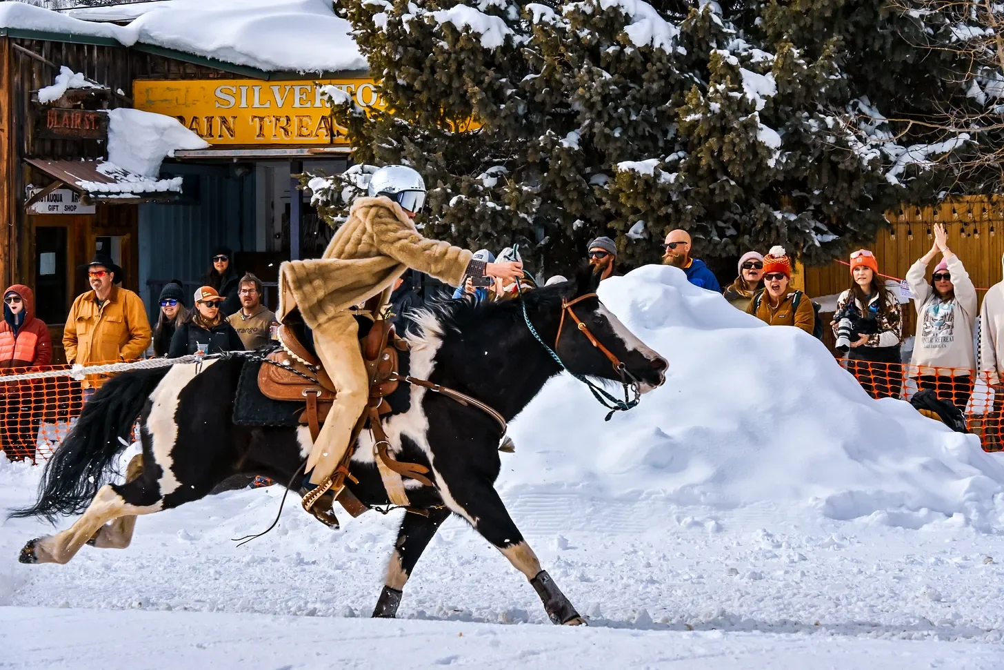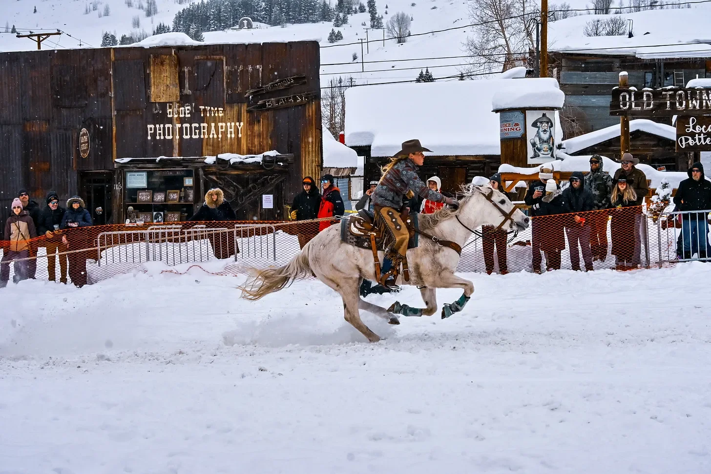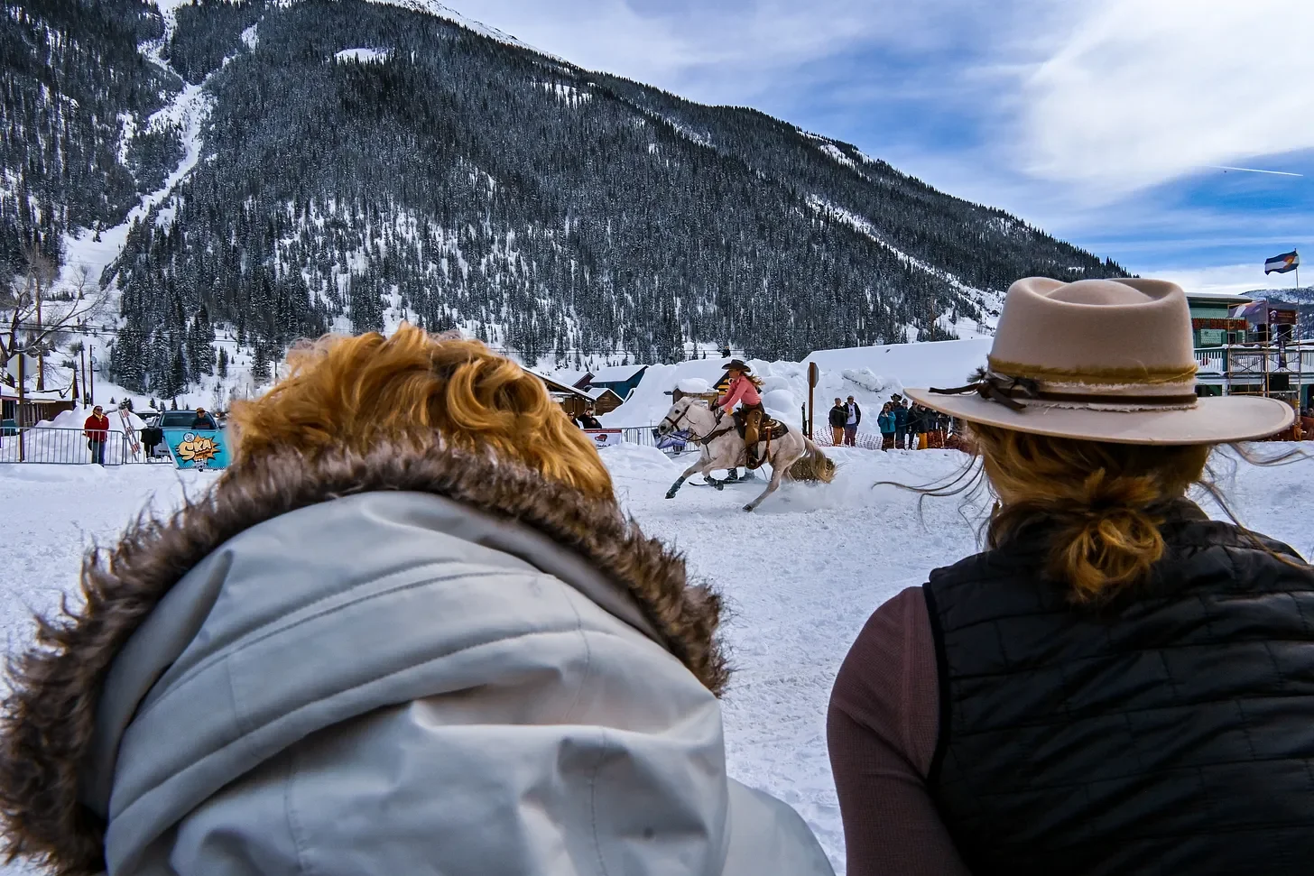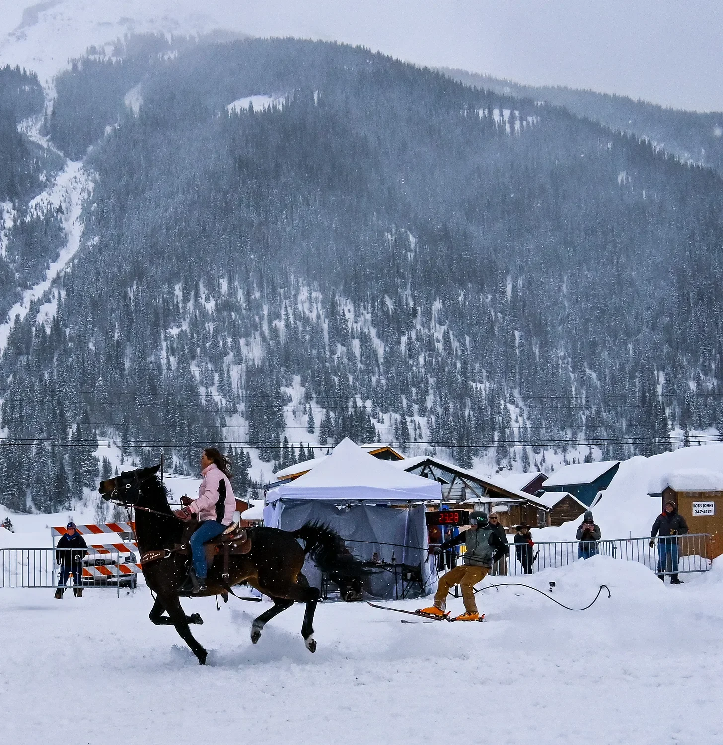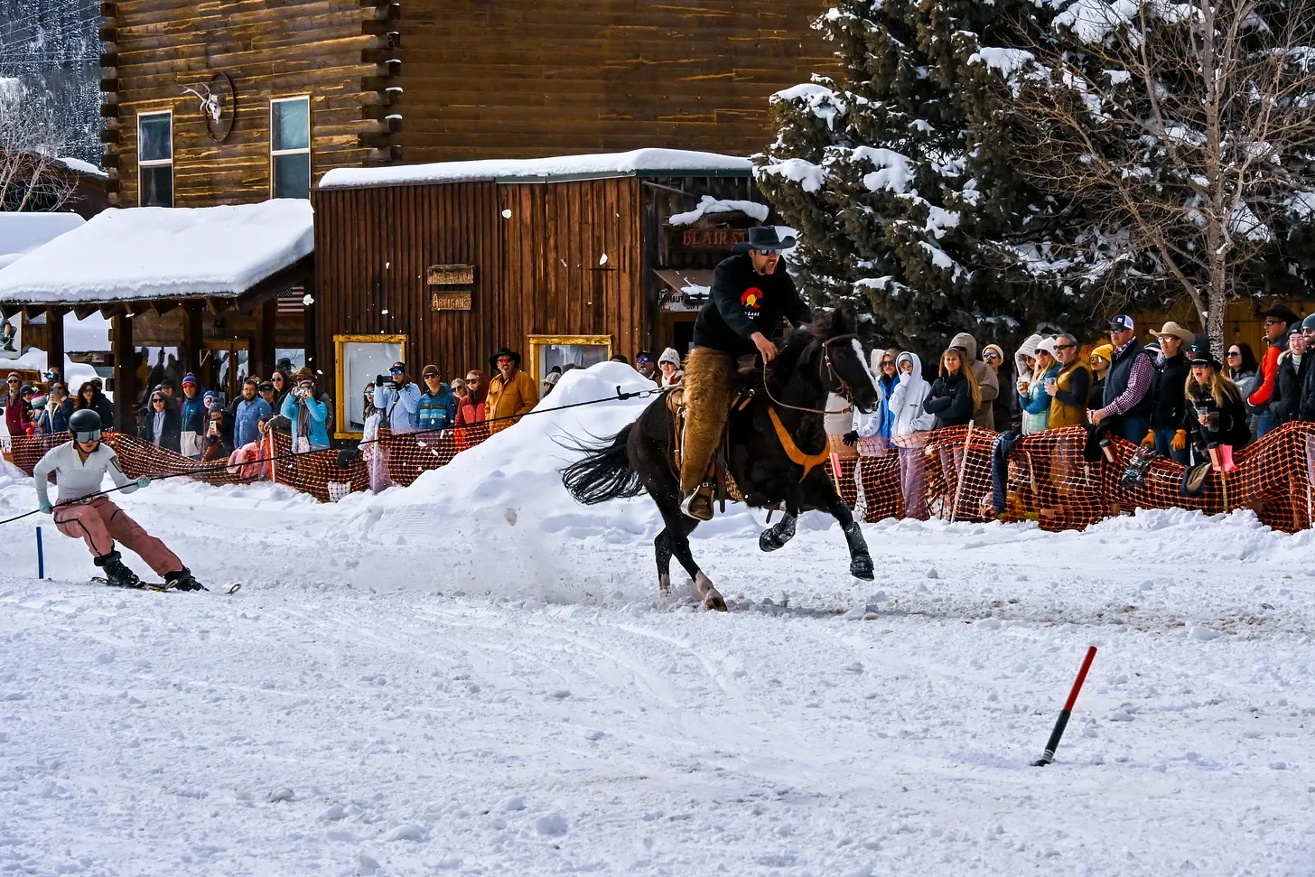 The snow continued to fall in a blanket. The skiers, riders, and horses didn’t seem to care. One after another they raced several blocks down Blair Street, flying down the track in fewer than 25 seconds.