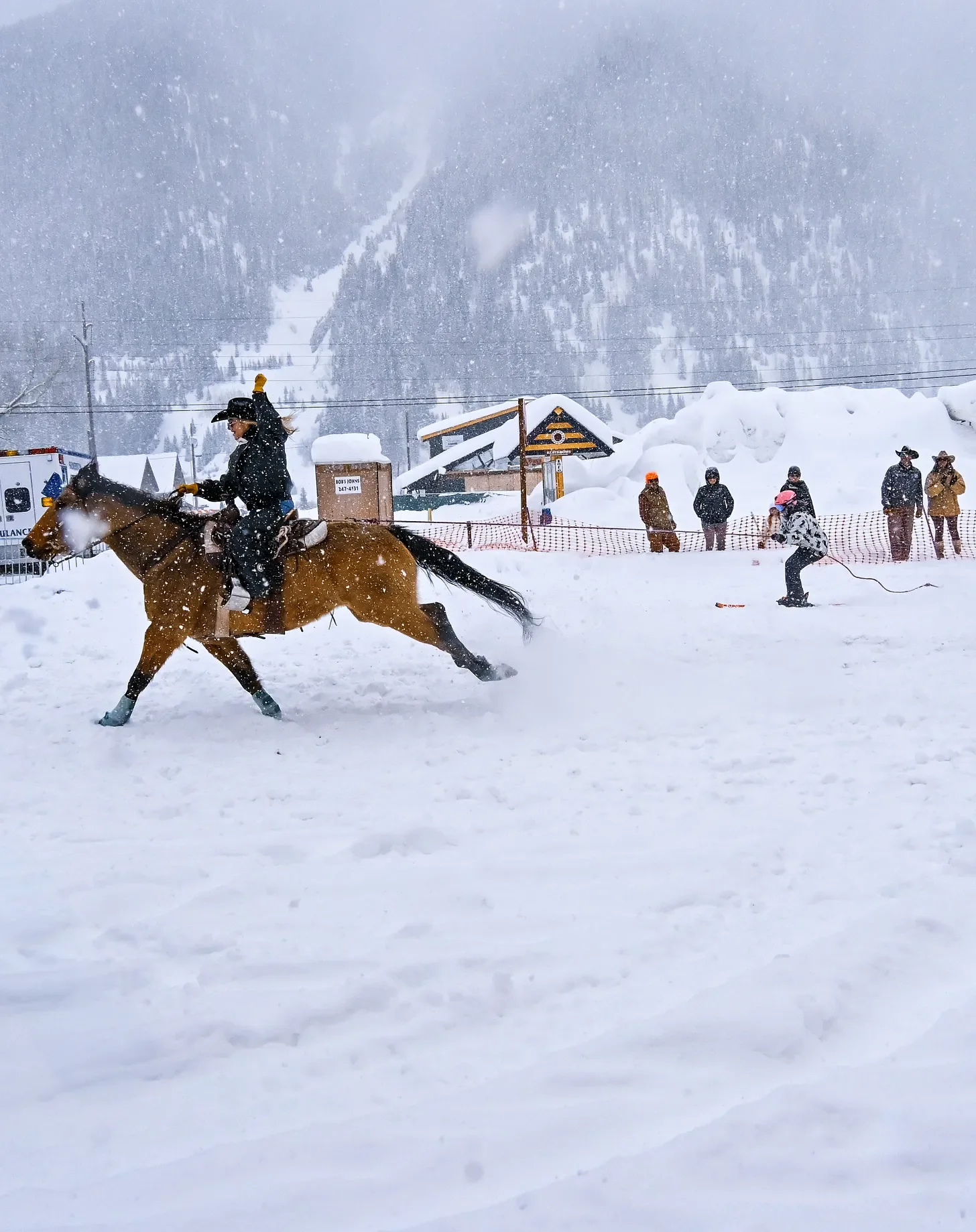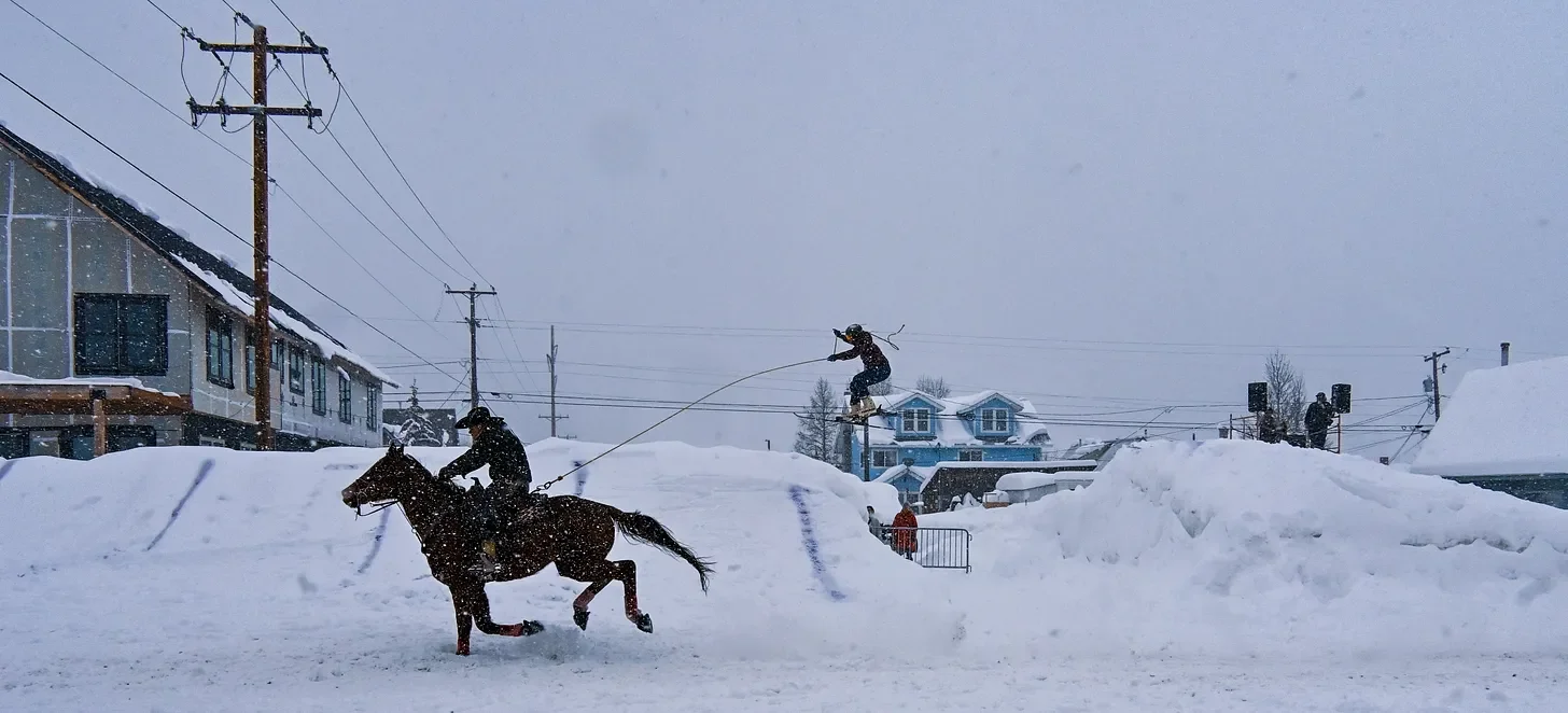 The amateur category switched to pro and they opened a large gap jump. The skiers flew through the air while the riders whooped, one hand holding down their hats, the other gripping the reins.